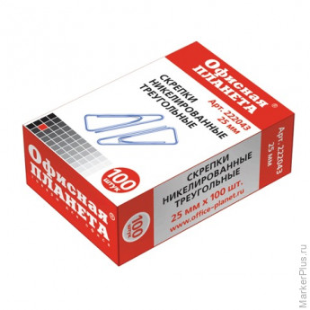 Скрепки ОФИСНАЯ ПЛАНЕТА, 25 мм, никелированные, треугольные, 100 шт., в картонной коробке, 222043, комплект 100 шт